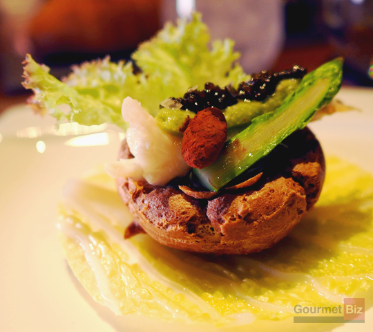 カカオ42%のチョコを使用したシューの上にはアボカド、キャビア、ラングスティーヌ(ヨーロッパに生息するエビの一種で別名アカザエビ)のグリル。カカオをまぶしたアーモンドが添えられる。シューのフィリングにアボカドのクリーミーさがベストマッチ。キャビアとグリルしたエビの塩気が食欲を程よく刺激する。