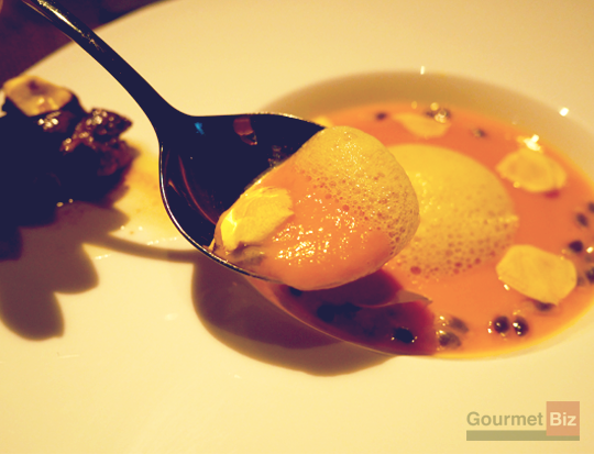 キャロットスープの中央にパッションフルーツのポンヌ、さらにパッションフルーツのタネが浮かぶ。横にはカカオ62%のチョコをしのばせたフォアグラのソテーが。フォアグラを口に含むとチョコの香りが広がるようになっており、パッションフルーツの酸味と濃厚なフォアグラが好相性。