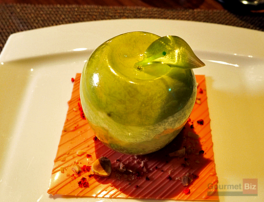 薄く型どられた青リンゴの飴細工の中に魔法のように閉じ込めた冷たいスイーツたち。中にはエスプーマで泡立てたライム風味のショコラブランと、ソテーした青リンゴをライムとマリネして一晩漬けたもの、さらに青リンゴのソルベが。スプーンで軽く叩き崩しながら、下に敷いたストロベリーチョコと一緒に頂けるようになっている。
