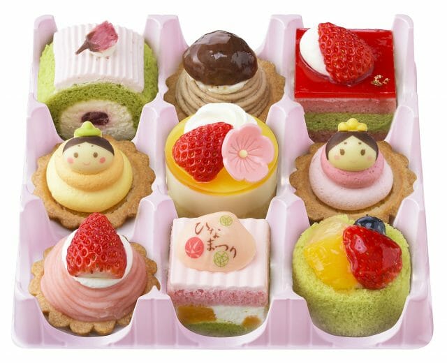 おだいりさま&おひなさまと、春色プチケーキをアソートした「ひなパーティー(9個入)」、抹茶&苺風味スポンジとクリームを重ねて“ひなカラー”に仕上げた「ひなおうぎ」などをラインアップ。