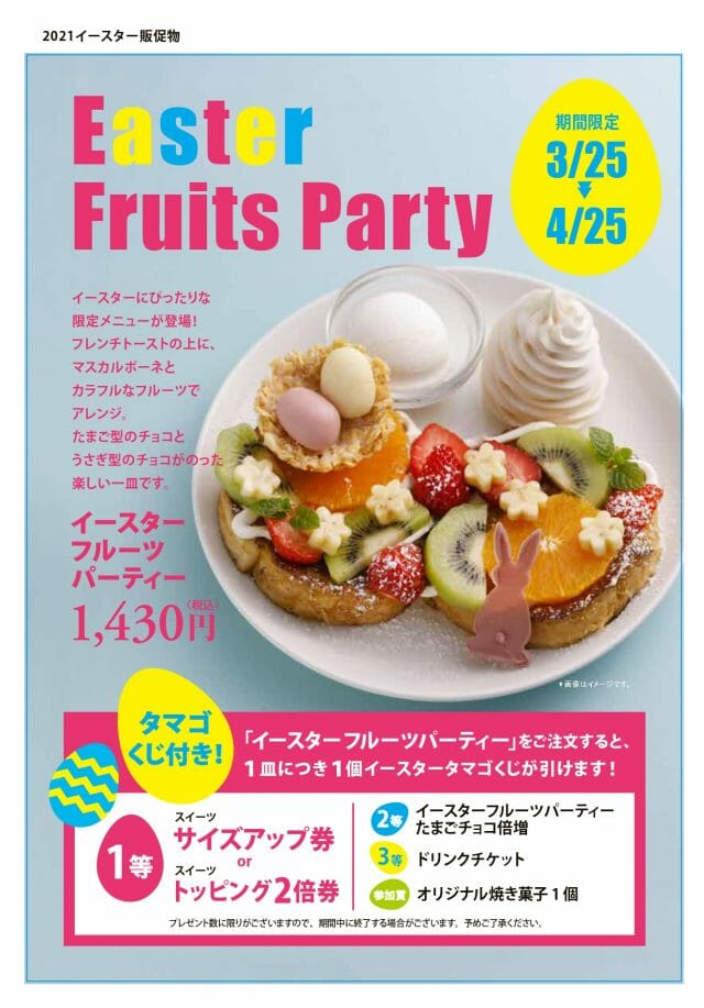 •概 要:「イースターフルーツパーティー」1皿ご注文につき、1回、『イースタータマゴくじ』が引けます。サイズアップチケット、ドリンクチケットなどが当たる、はずれなしのタマゴくじを引いて、Ivorishのイースターを存分に楽しむことができます。