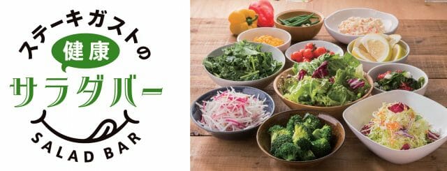 ステーキガストの全ての鉄板メニューに+400円(税込440円)でサラダ・カレー・スープ・デザート・パン等約20種が食べ放題の健康サラダバーをつけることができます。季節毎にメニューの入れ替えを行っています。
