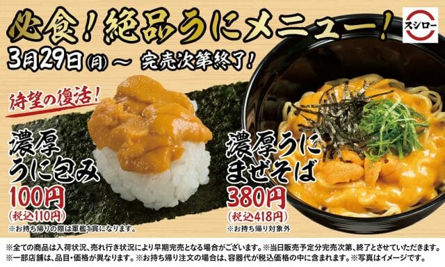 スシロー 自信のうにを味わえる「濃厚うに包み」と「濃厚うにまぜそば」が期間限定で登場