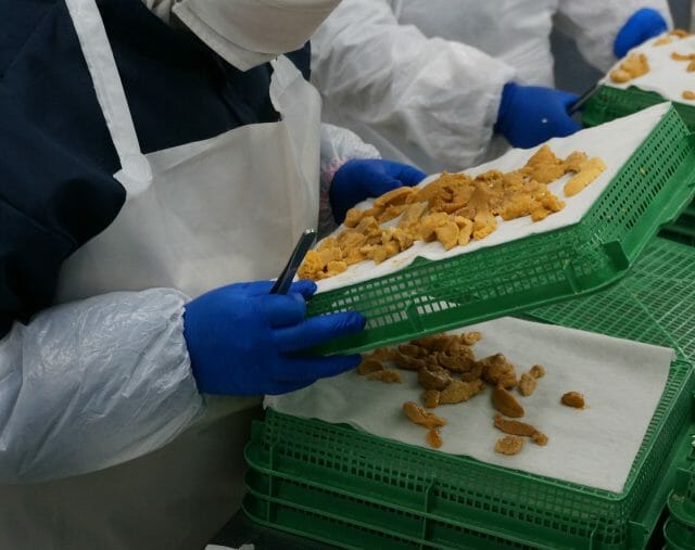 スシローでは2013年まで定番メニューでうにを販売していましたが、社内試食会等で味に対するシビアな意見を受け、素材にこだわるスシローだからこそ販売を一度中止。再度美味しいうにを探し求め、世界のうに漁獲量No.1のチリにたどり着きました。その後うにの旨味や風味を損なわないまま日本に運べるよう、仕入れ担当が現地まで視察に行って加工・物流までを見直した結果、現在では本当に美味しく品質の良いうにを仕入れることができています。