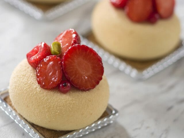 ブロンドショコラのムースの中にいちごのコンポートとトンカ豆のブリュレを入れました。