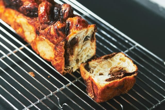 CHOCOLATE BANKの人気製品。国産の発酵バターを使ったサクサク食感のクロワッサン生地に、和三盆入りのチョコレートをたっぷり練りこんだチョコレート食パンを数量限定で用意します。
