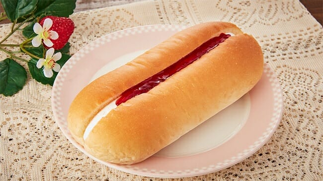 ロールパンにホイップクリームを絞り、果肉入りの甘酸っぱい苺ソースをかけました。