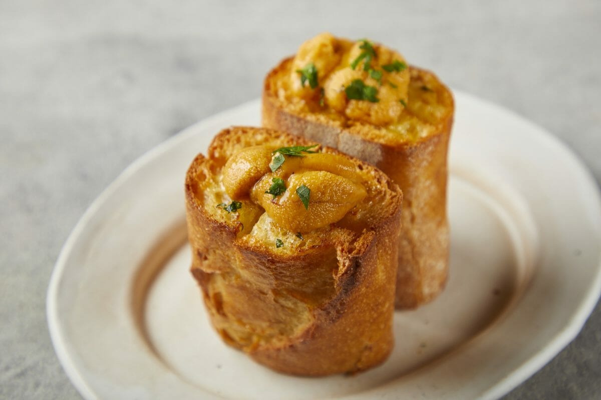 フォアグラ、ウニ、パテドカンパーニュ、チーズなどを使い、もちもち食感 風味豊かなパンをレストランの一品に
