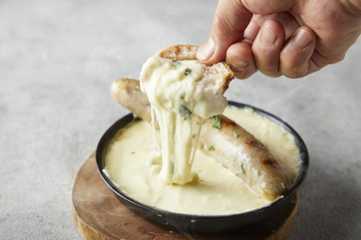 チーズフォンデュと肉汁溢れるソーセージをパンと合わせて