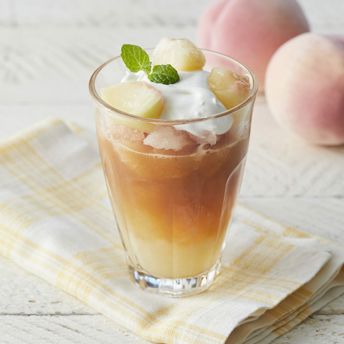 商品説明:アールグレイのアイスティーにたっぷりの白桃シャーベット、白桃ピューレを合わせ、チーズホイップをトッピング。