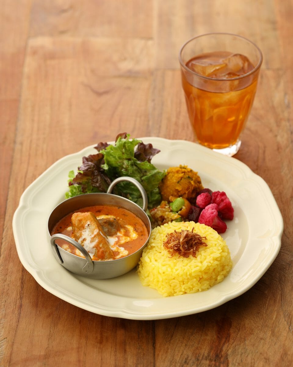 商品説明:8 種のオリジナルスパイスと濃厚なアーモンドミルクで仕上げたコクのあるトマトカレーにソテーオニオンを加え、バルサミコ酢や蜂蜜などでマリネしたポークと揚げナスをトッピング。枝豆とクスクスのスパイスデリ、ビーツとざくろのマリネなどを添えて。