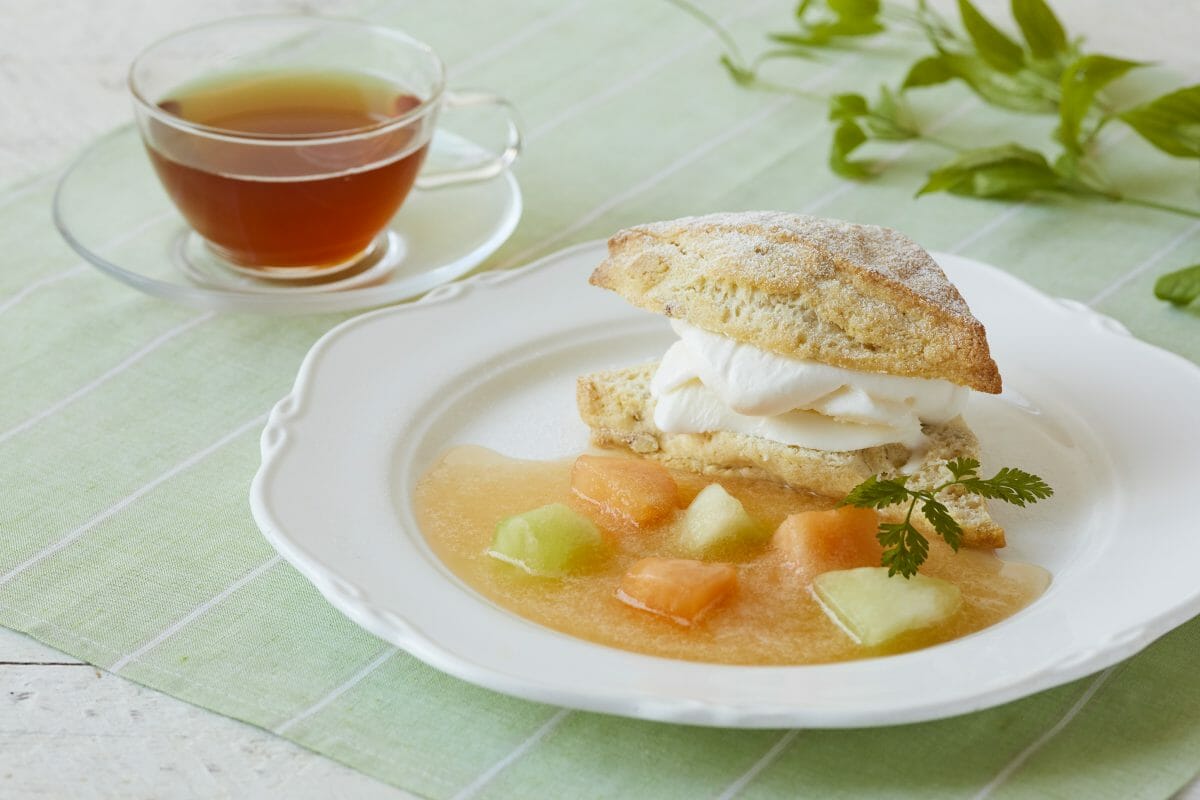 商品説明:くるみ入りのさくふわ食感のスコーン生地に、ホイップクリームとミルクジェラートをサンドしました。2 種類のマスクメロン、自家製メロンソースを添えて。
