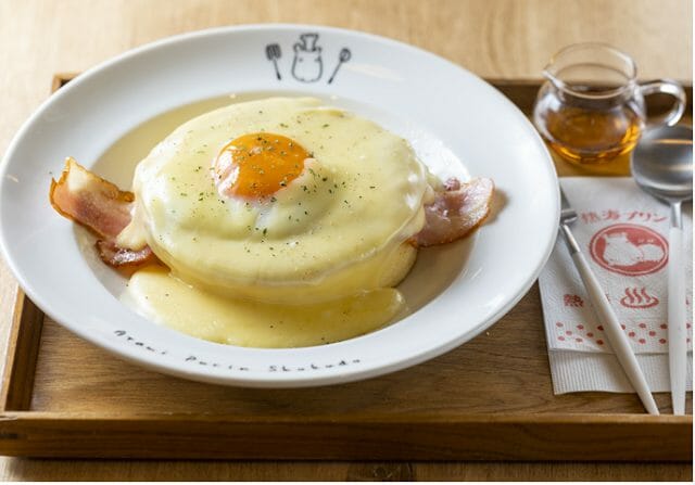 パンケーキの上には、熱海プリン食堂名物のモッツァレラチーズとゴーダチーズをブレンドしたチーズソースをたっぷりとかけました。ベーコンと目玉焼きをのせたスイーツタイム限定のお食事パンケーキとなっています。