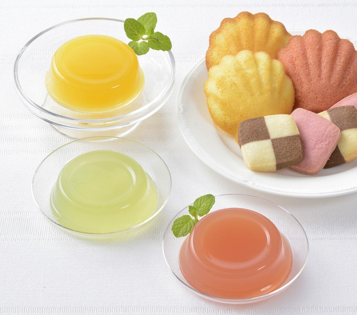 季節限定マドレーヌ&ゼリー、人気の「バターマドレーヌ」とクッキー2種をアソート。「レモンマドレーヌ」には、すがすがしい香りと酸味の瀬戸内レモンを、「ももマドレーヌ」には、芳醇な甘みと香りの岡山産白鳳を使用しました。