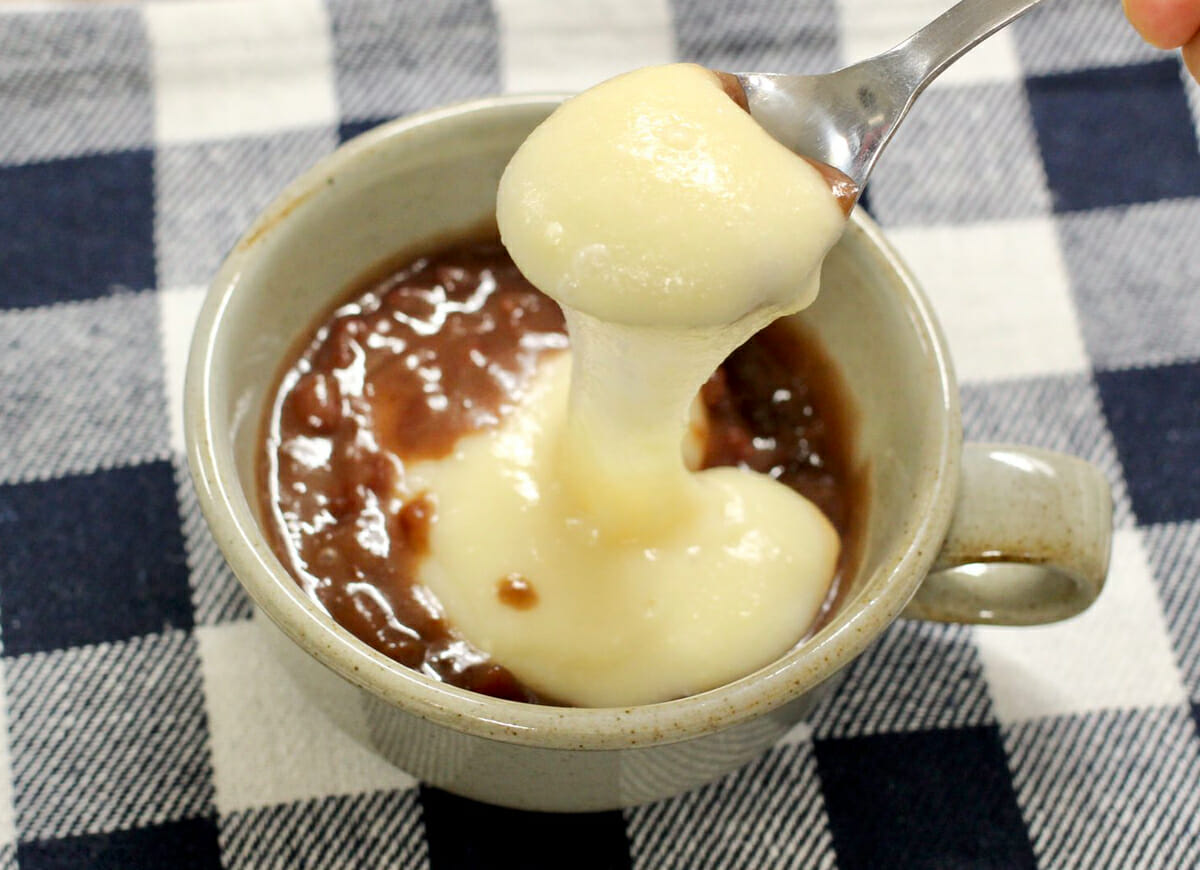 器にあんことおもちを入れると、もう食べられる状態に。なんといっても、果てしなく伸びるお餅のとろとろ感が魅力です。