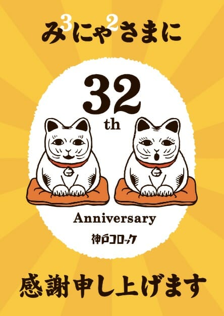1989年4月28日、「安心・安全で本当においしいコロッケを食卓に届けたい」という想いから誕生した神戸コロッケ。多くの支持を得て、32周年を迎えます。“長きにわたり支えてくださった「み(3)にゃ(2)さま」”への感謝の気持ちを込め、5月5日(水)までの期間限定で特別商品を用意します。