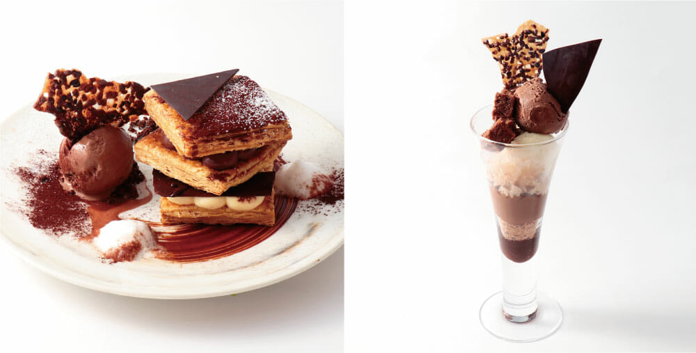 焼きたてのさくさくパイの間になめらかなショコラクリームと生クリームを加えたカスタードを挟み、ショコラアイスとカカオニブのチュイルを添えたミルフィーユ。