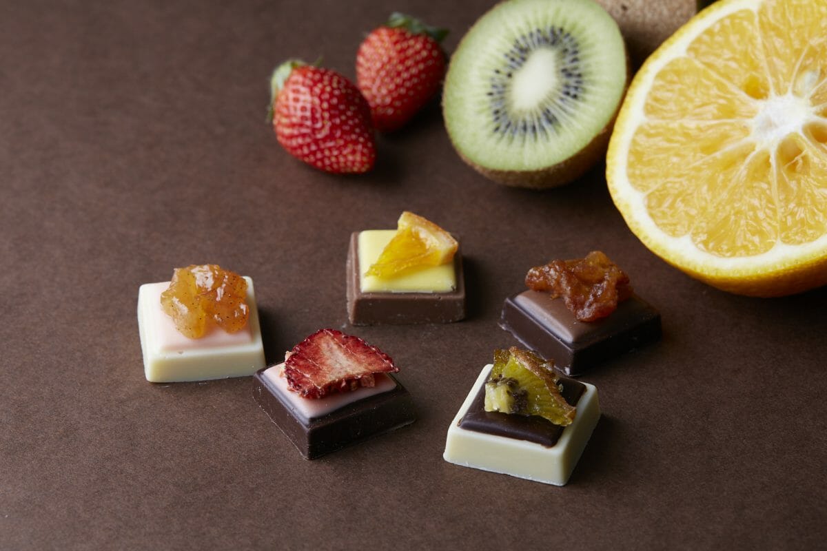 国産の素材にこだわり、りんごや白桃、苺、キウイ、伊予柑のピューレや果汁を使用したショコラとなっています。