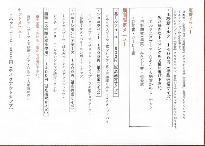 最高級のふわふわ氷に「玉砂糖」を使用したミルクシロップをかけ、くちどけのいいミルクエスプーマなどをトッピングしてみて下さい。