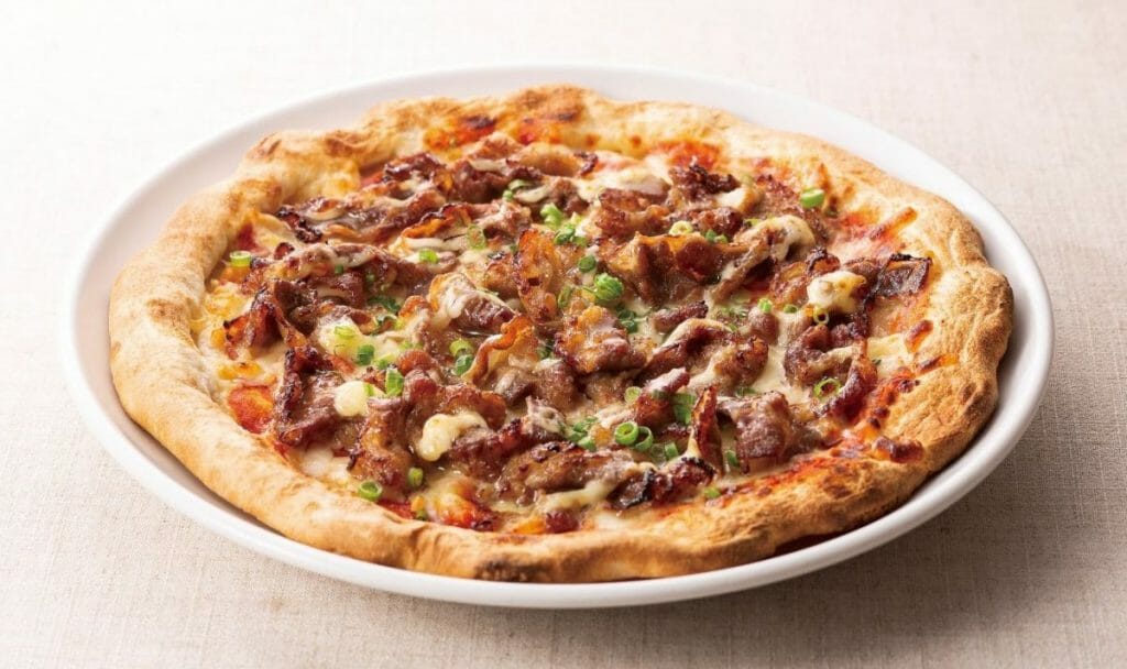ジューシーな牛カルビをトッピングして焼いた、ボリュームあるピザ。にんにくと生姜がきいた甘辛いタレをからめて焼いた牛カルビとマヨネーズの濃厚な味わいで、とまらないおいしさが特徴です。