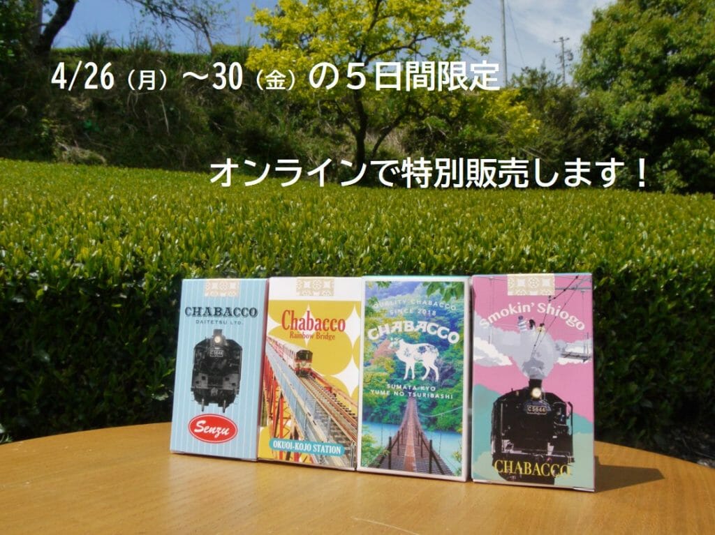 株式会社 KAWANEホールディングス(所在地:静岡県榛原郡川根本町、代表取締役:迫洋一郎)は、4月26日(月)~30日(金)の期間限定で「Chabacco(チャバコ)」のオンライン販売を実施します。