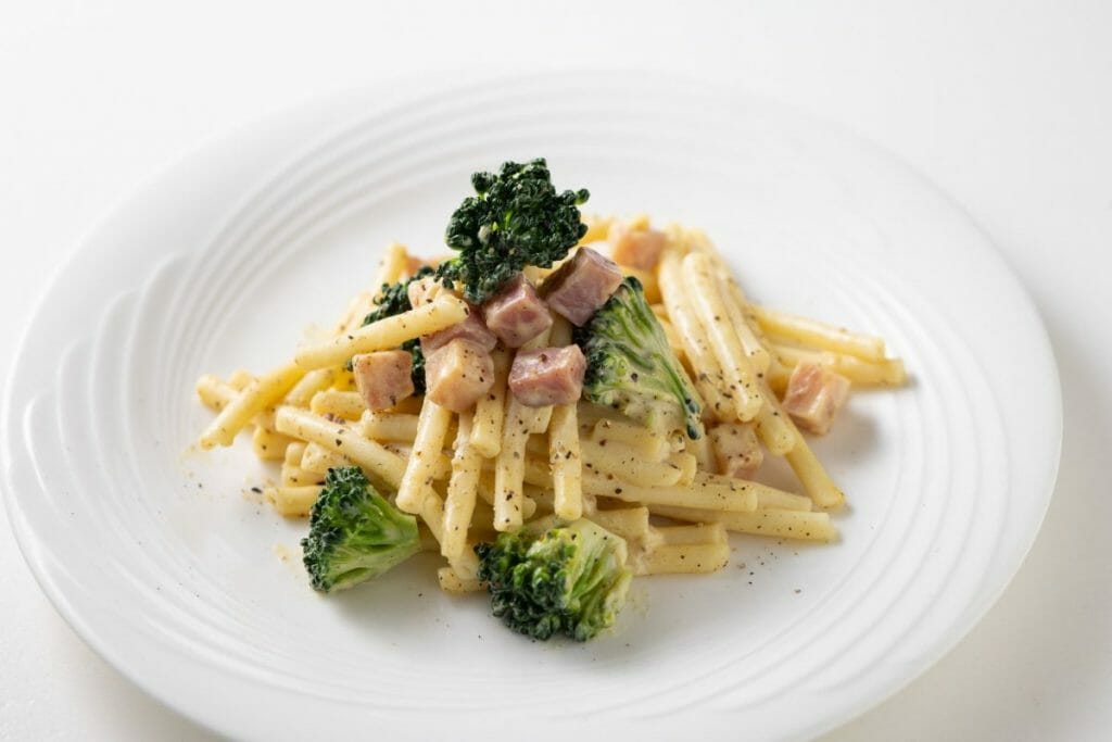 具材には歯ごたえの良いブロッコリーとベーコンを使用し、もちもちのブカティーニと相性抜群。さらにソースにはフレンチマスタードとアンチョビを使用。ブラックペッパーも効かせた大人の味付けはまさに新感覚。