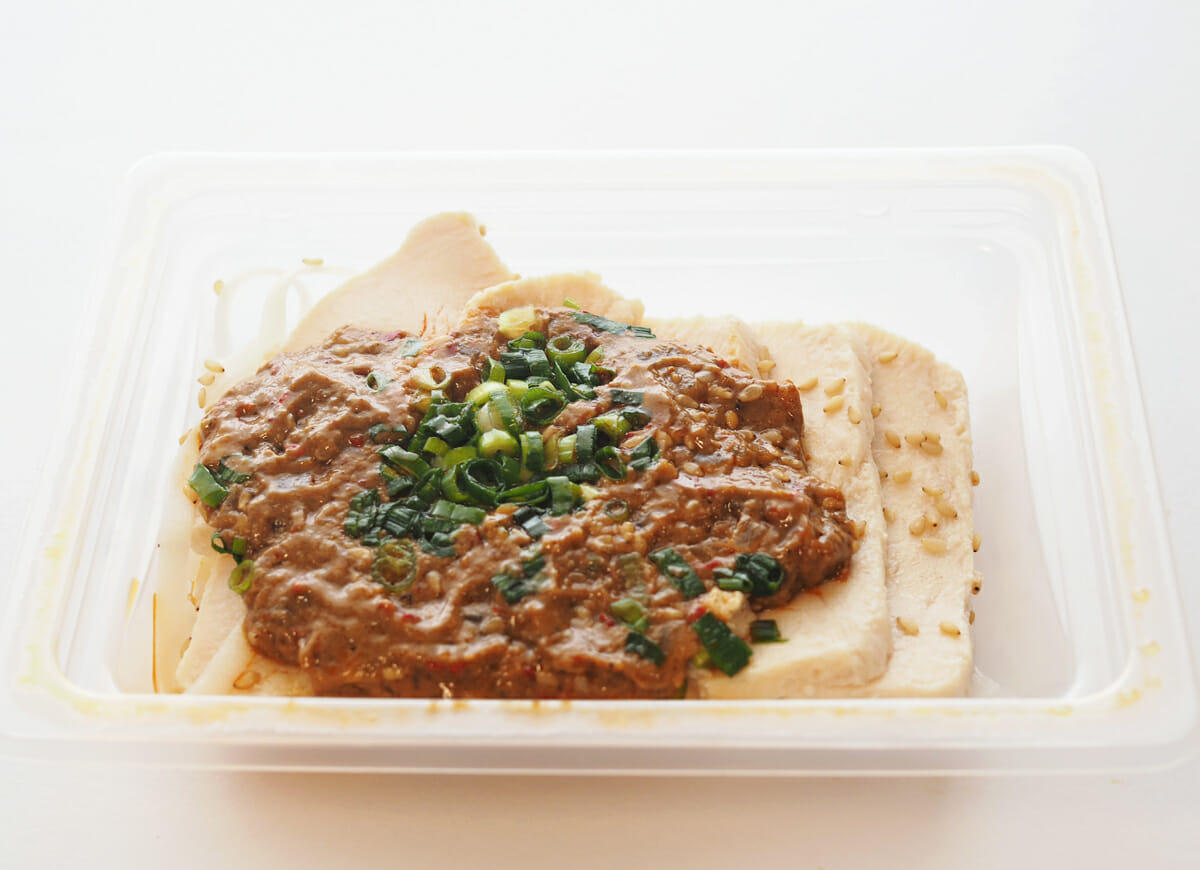サラダチキンスライスに花椒の痺れる辛さが特徴のタレをかけた冷製のよだれ鶏です。