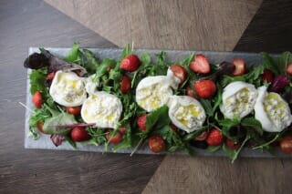 賞味期限が短く他のチーズよりも鮮度が重要なため、ローマ商店で提供する「ブッラータ」は、店内で手作りしており、作り立ての鮮度の良いものを味わうことが可能です。オリーブオイルを垂らしたり、塩こしょうで味をつけたり、生ハムにまいて食べたりすることはもちろん、季節のフルーツや野菜とともに楽しめる商品を多数用意しています。今の時期はいちごやアスパラとともに堪能できます。その後はメロンとズッキーニや、桃とカラフルトマトなど季節を舌で堪能できるような商品を予定しています。