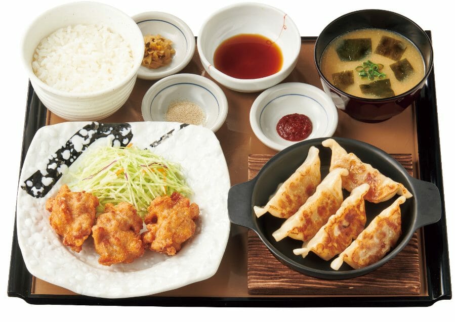 『鉄板餃子とから揚げの定食』は、肉と野菜の甘味を感じるジューシーな餃子を熱々の鉄板で、鶏もも肉のから揚げと共に提供します。大ぶりの餃子はオイスターソースでコクと旨味をプラスし、ニンニクと生姜を控えめにした、優しい味わいとなっています。別添の辛子味噌で、味に変化をつけられるようになっています。
