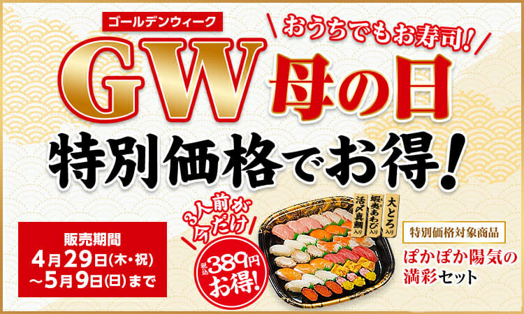 この時期限定の贅沢ネタ『地中海産 本鮪大とろ』『蝦夷あわび』など12種類のネタが入った3人前のお寿司に加え、食べるのはもちろん、作るのも親子で楽しめる「手巻き寿司セット」、さらに「とり唐揚げ」「フライドポテト」と満腹間違いなし!こんなワクワク楽しいセットを期間中、389円(税込)お得な6,415円(税込)で提供します。同セットだけで食卓が一気にパーティーの雰囲気になる事請け合い!“母の日”にぴったりの大変おすすめのセットです。