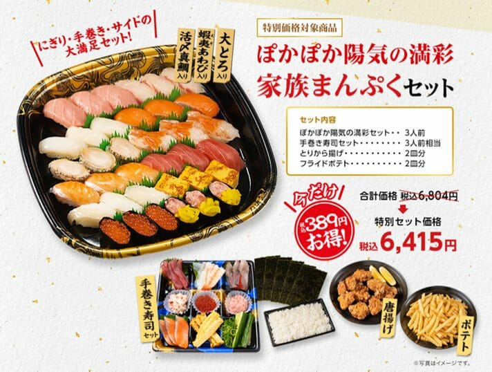 お寿司のみの『ぽかぽか陽気の満彩セット』も特別価格で用意。1〜6人前まで用意していますので用途にあわせて利用することができます。