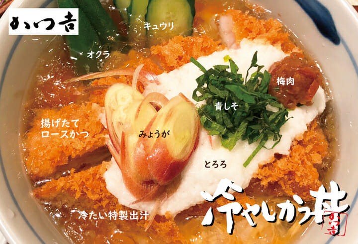 丁寧に取ったお出汁をベースに「特製醤油出汁」を作り、冷水で洗った白米の上に揚げたての「とんかつ」を盛り付けます。そこに夏野菜(みょうが・キュウリ・オクラ・青しそ)と梅肉、「とろろ」を盛り付け、クラッシュ氷で仕上げるかつ丼となっています。キンキンな冷たさで味わう商品となっています。