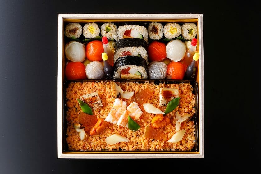 和食文化の継承と発展に努める"現代の名工" 宮田勇が手掛ける「新江戸前バラちらし」。色鮮やかな手毬寿司、手巻き寿司とともに敷き詰めました。