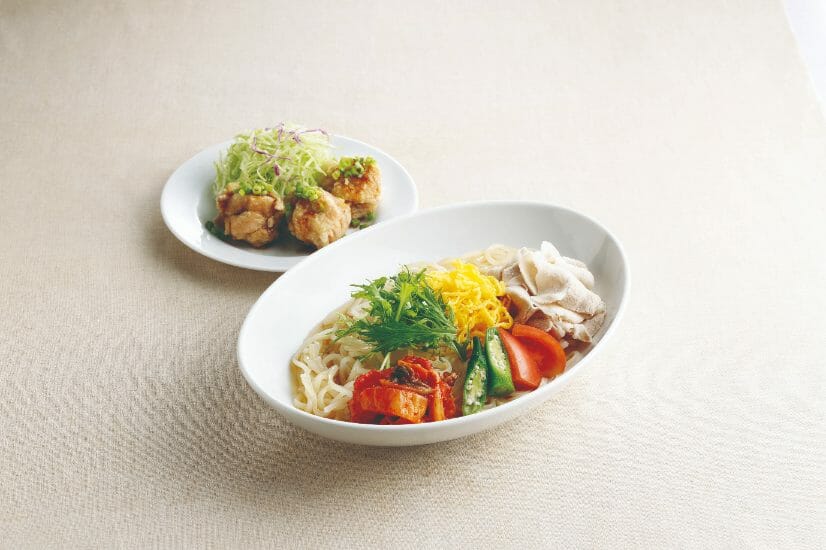 冷麺独特の弾力ある麺と、すっきりピリ辛なスープが相性抜群で、食欲がないときでもつるっと食べられる暑い日におすすめのメニューとなっています。豚肉にかける特製ダレがスープに溶け込んで奥深い味わいが楽しめるようになっています。