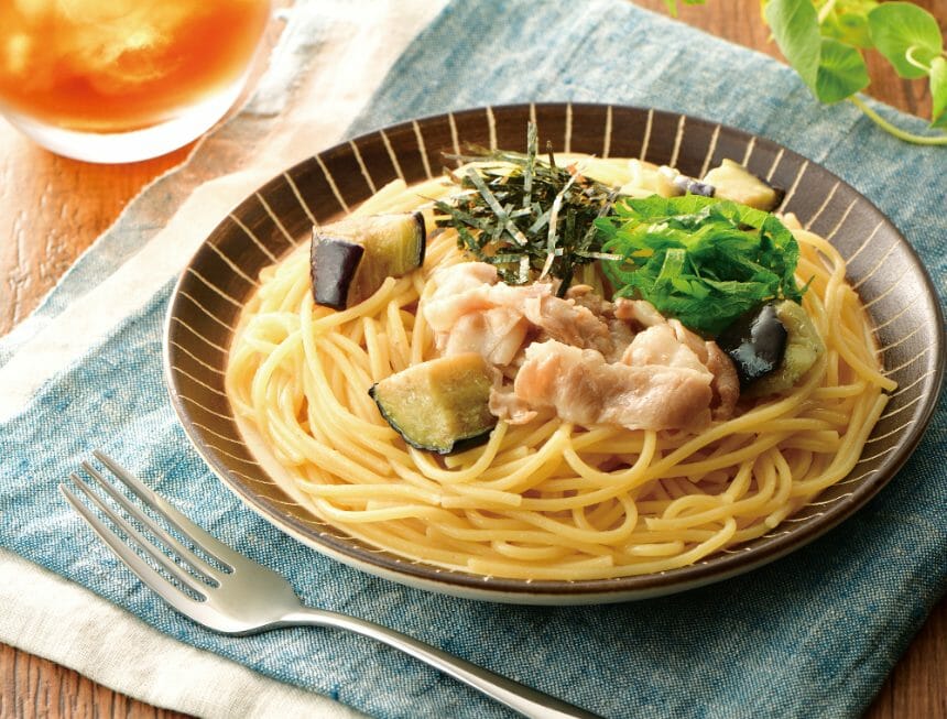パスタの新メニュー「豚しゃぶと揚げ茄子の和風オイルソース」は、毎年こ好評を得ている醤油ごまダレで味付けした豚しゃぶと揚げ茄子の和風パスタてとなっています。今年は+110円で豚しゃぶを2倍に増量できますので、いつもよりボリュームのあるランチタイムにもおすすめてとなっています。