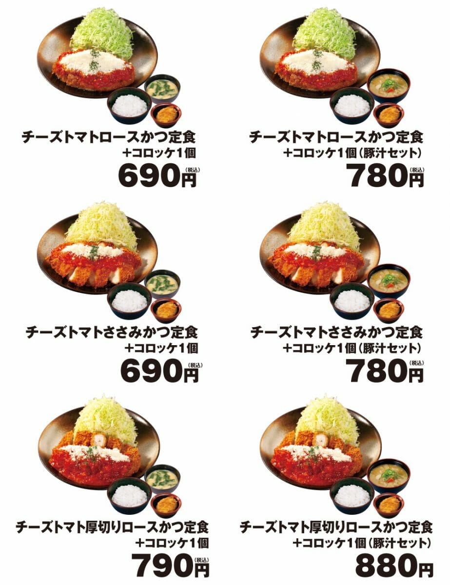 「チーズトマトロースかつ定食」「チーズトマトささみかつ定食」「チーズトマト厚切りロースかつ定食」を注文のお客に限り、「コロッケ1個」を無料サービス!また、ボリューム満点、‘あつあつで具だくさんな豚汁’を通常から半額の「90円」で提供します。
