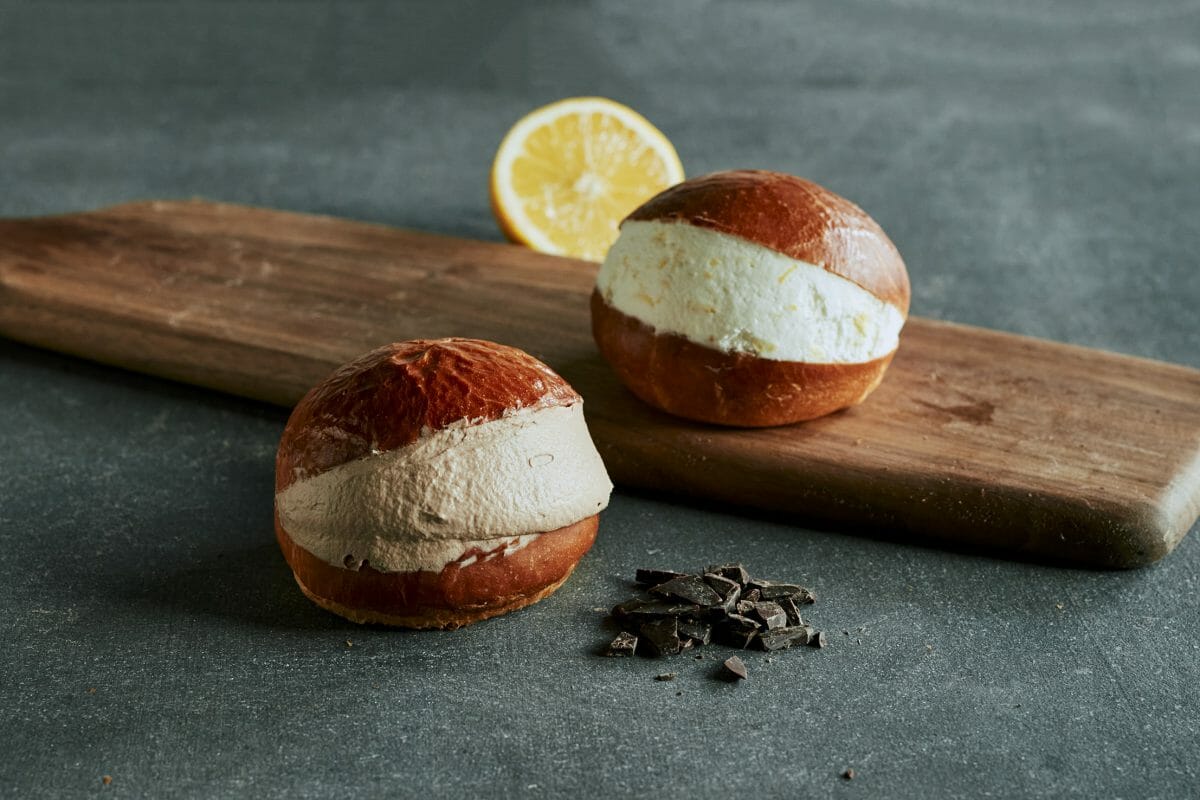 コロンビア産の香り高い発酵カカオバターを主役にしたブリオッシュに、国産レモンの果汁と皮をたっぷり加えた生クリームを絞りました。マリトッツォは連日100個以上が完売するBANKの人気品。