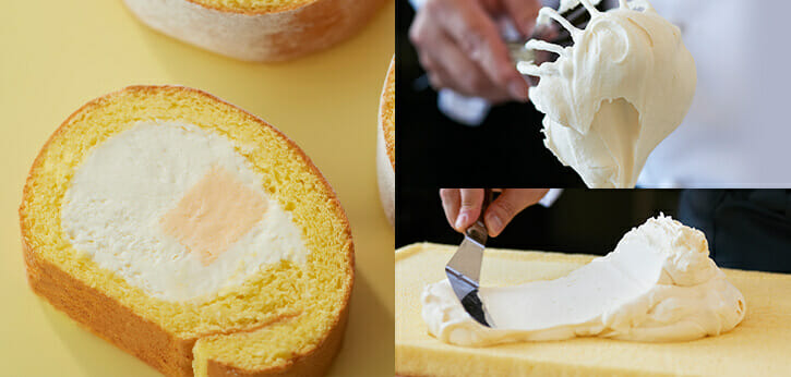 巻き込みを減らした、ふっくらしたスポンジ生地の内側には特製チーズクリームをたっぷり使用。ロール中心にあるのは北海道産クリームチーズを使用したベイクドチーズ。