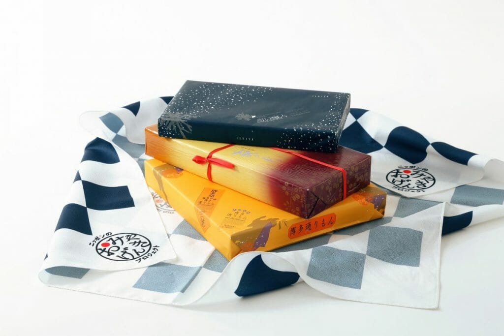 まずはプロジェクト第1弾として、3社それぞれの代表菓子である「白い恋人」「萩の月」「博多通りもん」を、オリジナル風呂敷とセットでひと箱に詰め合わせた「おみやげんきBOX」を、5月16日(日)からプロジェクトのWEBサイト限定でオンライン販売を開始します。