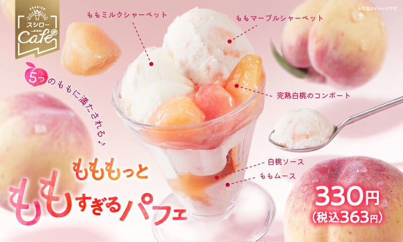 また、昨年5月に期間限定で販売し、約40万食以上を売り上げ、大好評を博した「ももっとももすぎるパフェ」が、“桃感”をパワーアップさせ「もももっとももすぎるパフェ」として新登場します。甘酸っぱい桃のソースが入った桃マーブルシャーベットと、桃の風味が香る桃ミルクシャーベットのダブルアイスに、香り高い白桃ソースや完熟白桃のコンポートをトッピングし、より桃を存分に感じられる仕上がりになっています。