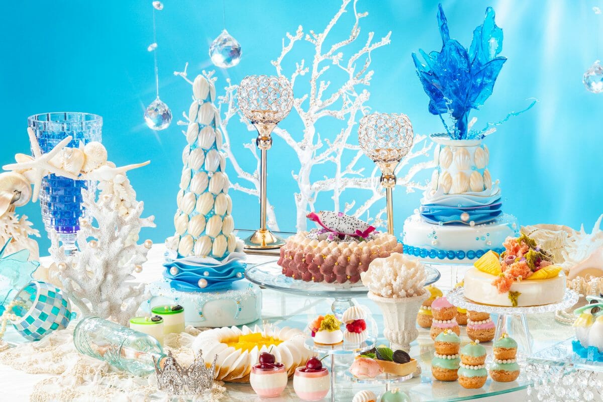 どこまでも澄み切った青空とエメラルドグリーンの海、水面を照らす太陽の光がまるでクリスタルのような輝きを放つ神秘的な情景に現れるプリンセス・マーメイドから着想を得た夏のスイーツビュッフェは、ヒルトン東京 エグゼクティブ・ペストリーシェフ 播田 修(はりた おさむ)による新作スイーツ約30種類に加え、5種類の軽食とドイツの高級紅茶ブランド ロンネフェルトのティーセレクションやマーメイド着想のノンアルコールカクテルなどドリンク約20種類を取り揃えています。心地よい波の効果音や涼し気なプロジェクションマッピングの演出と共に、夏の優雅なアフタヌーンティータイムを楽しめるようになっています。料金は一人¥5,000(土日祝日¥5,400)で、午後2時半より5時半までの3部制にて毎日開催します。