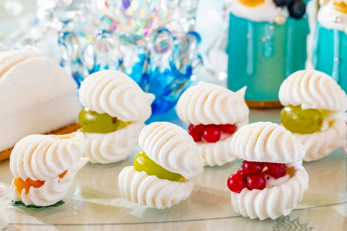 優雅な巻貝を思わせる「ロージーシェルの宝物」は、ふわふわのスポンジで白桃とミックスベリーをサンドした薔薇風味のショートケーキ。白ワインのムースの中に、はちみつで煮詰めたブルーベリーとカシスを配した「ブルーラグーン」他、白ごまのババロアに、パッションとパイナップルの酸味が爽やかな「真珠のブレスレット」などを楽しめるようになっています。