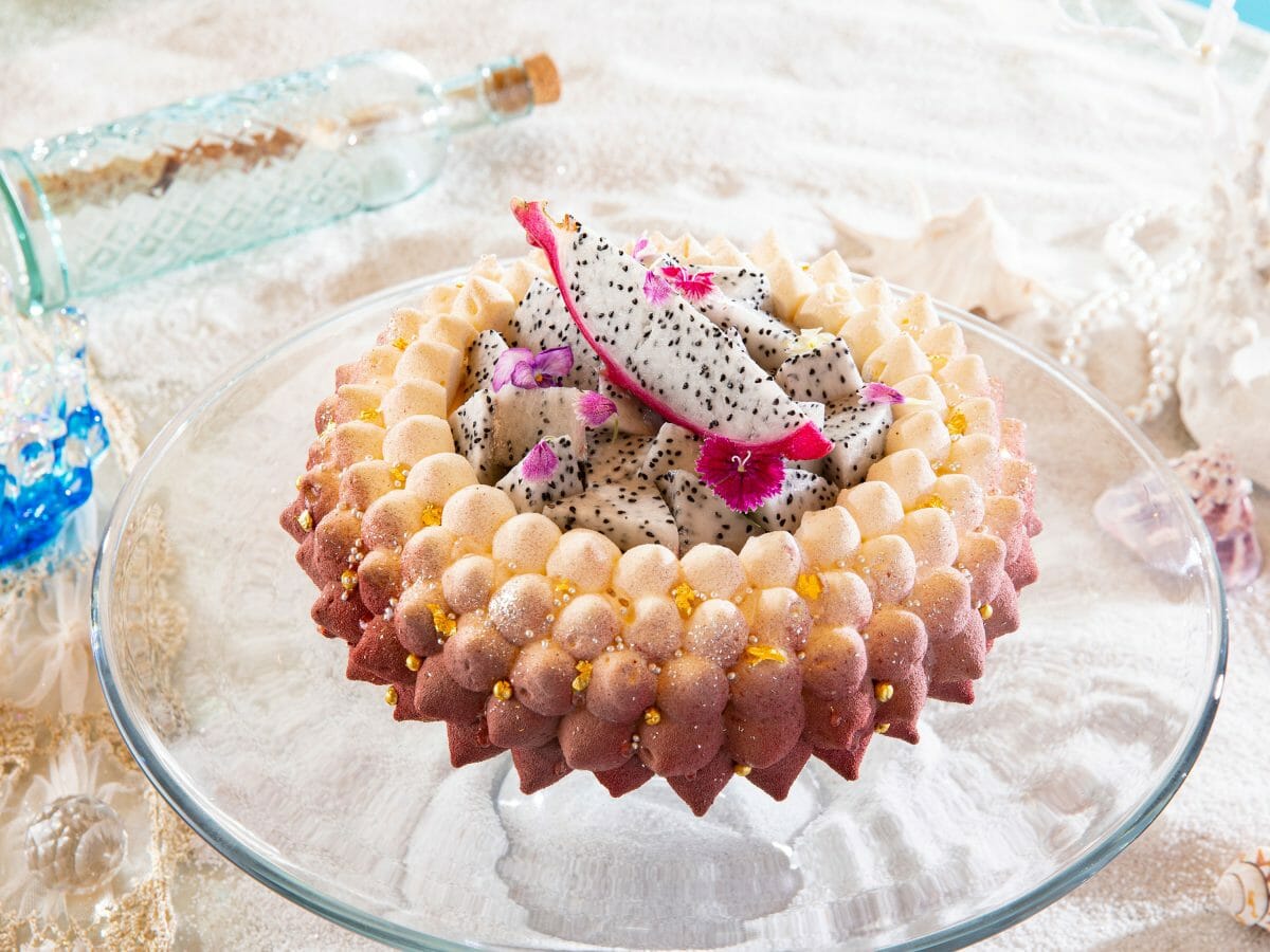 貝殻のようなフォルムに、たっぷりのドラゴンフルーツを冠した「プリンセス・マーメイドのティアラ」は、スーパーフード サボテンのピューレとカシス、イチジクのコンフィチュールをホワイトチョコレートのムースに閉じ込め、海のプリンセス マーメイドのティアラをイメージした華やかでほんのりと酸味を利かせた味わいとなっています。