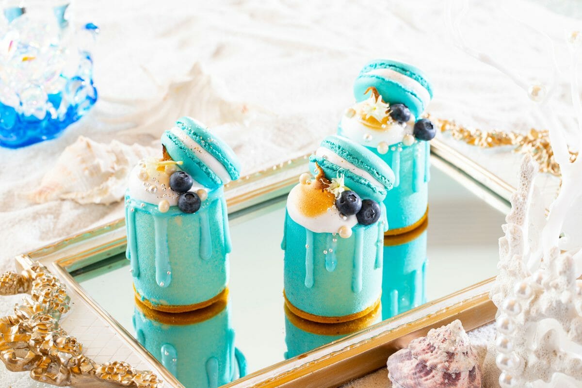 その他にも、赤桃とバニラカスタード入りシュー菓子「人魚の涙のルリジューズ」、ヤドカリのようなフォルムが可愛いアサイーとブルーベリーのジュレ入りヨーグルトムース「マーメイドのお供」、まるで人魚の尾のようなガレットブルトンヌ生地のお菓子「恋するマーメイド」や「サンセットジュレ」など一つ一つ丁寧に作られたスモールポーションのスイーツも見逃せません。