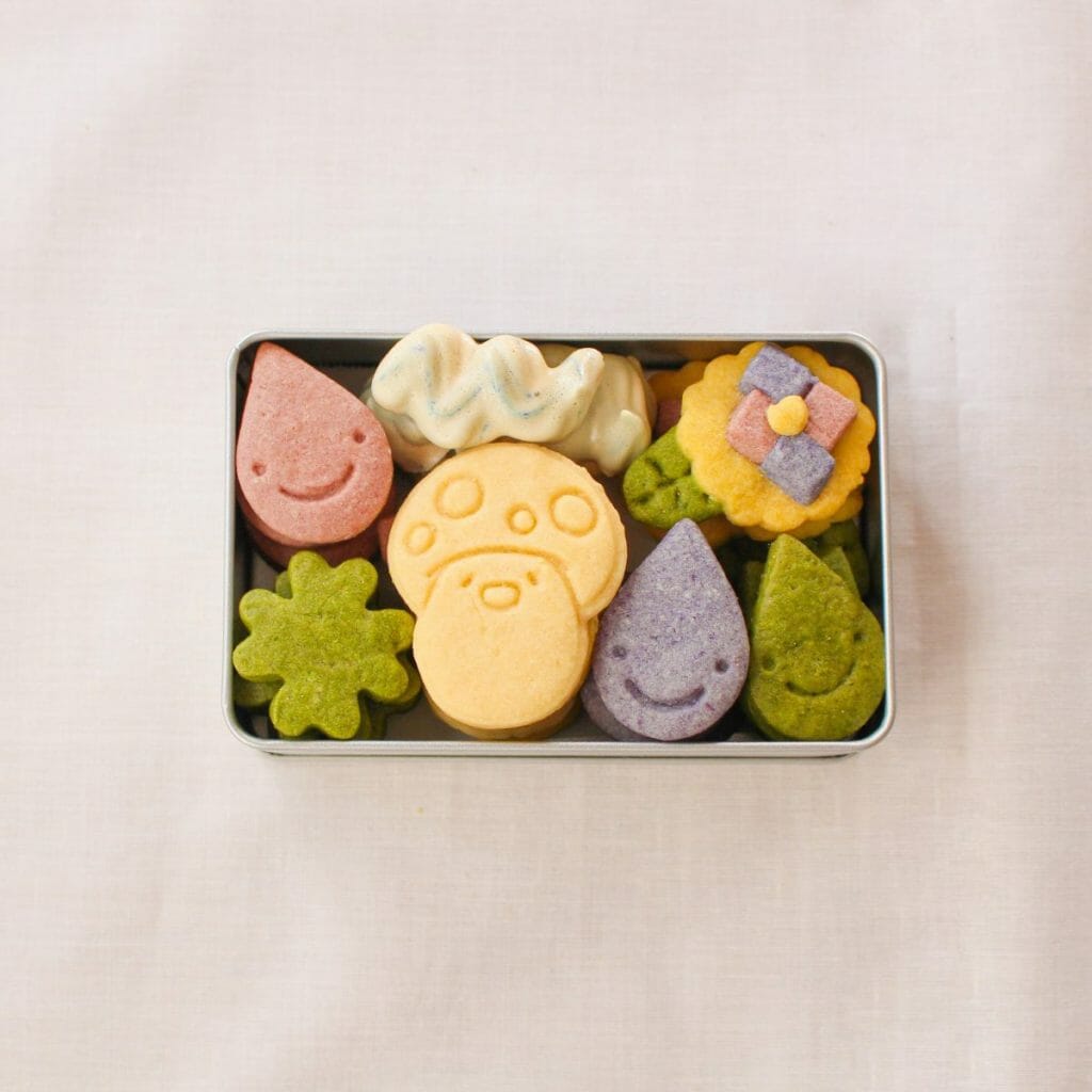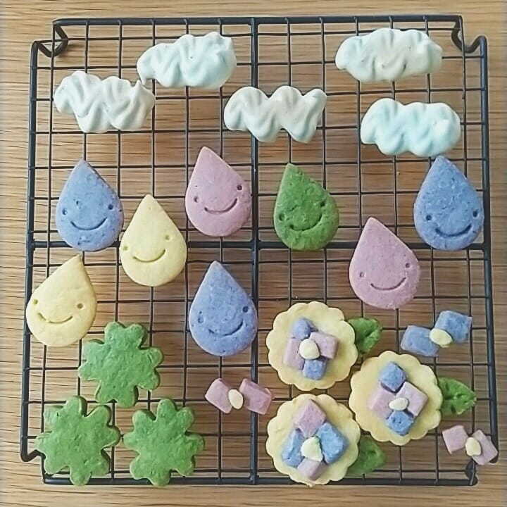 6月のクッキー缶は、梅雨の季節を意識した水玉・四つ葉のクローバー・紫陽花・メレンゲの雲(着色料不使用、抹茶、野菜、花のパウダー)。
