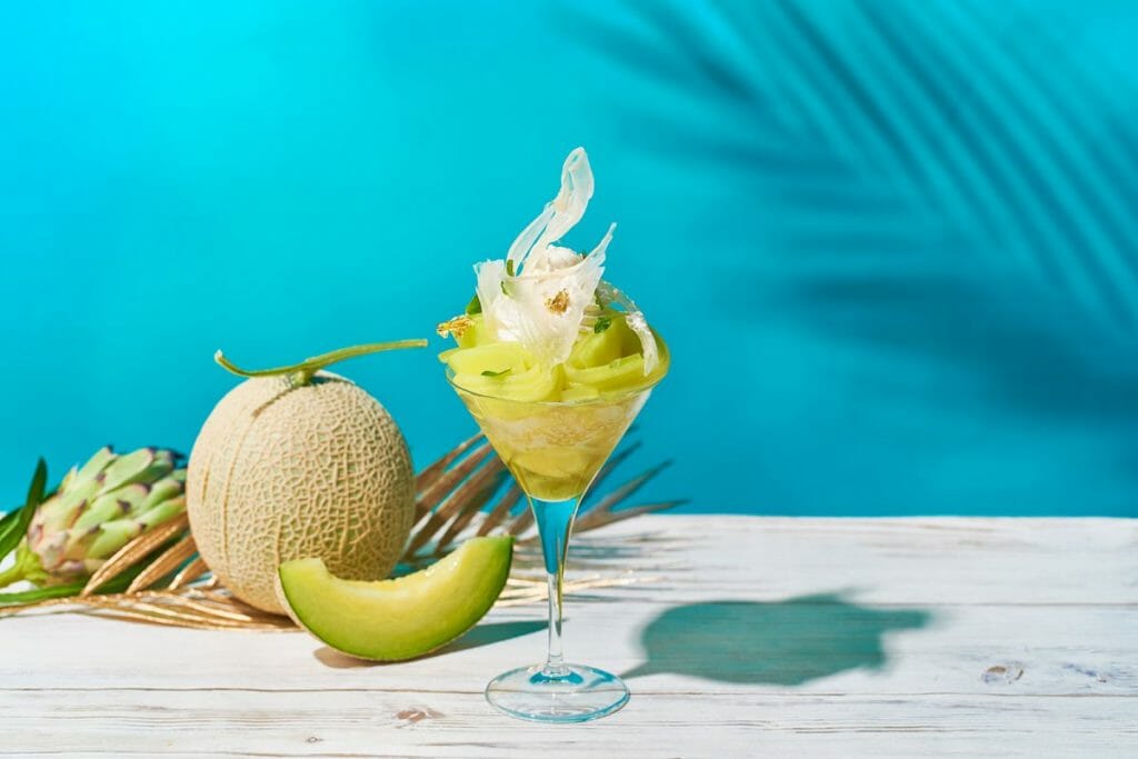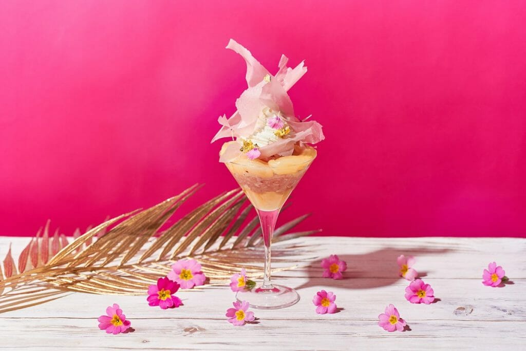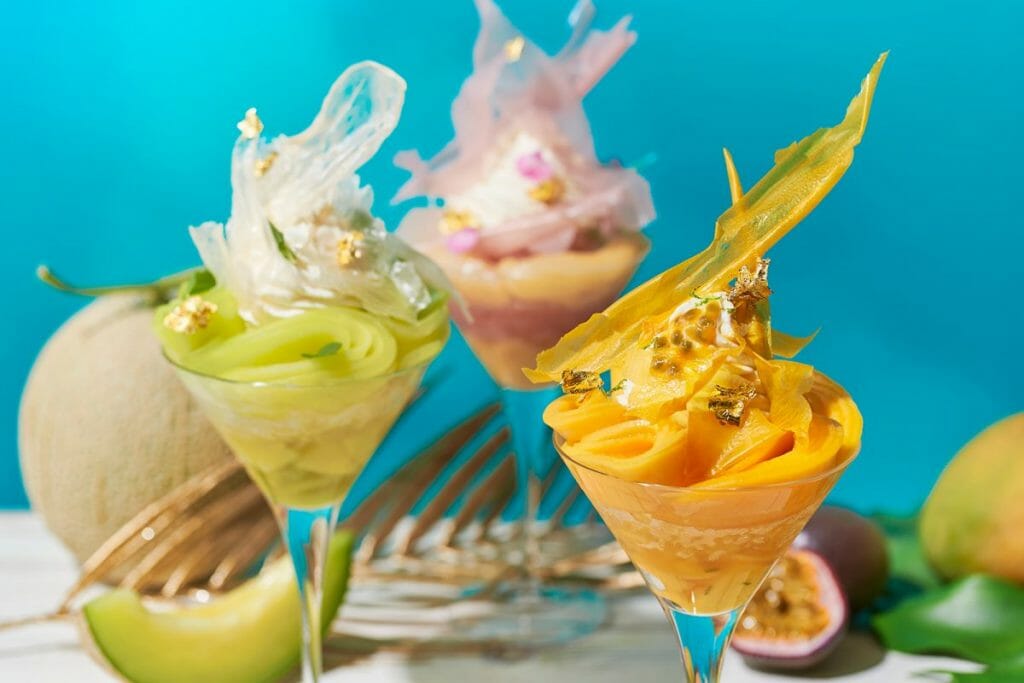 メロン&マスカット、桃、マンゴーを使った「フルーツベールパフェ」は、旬の果物とリキュールやロゼスパークリングを使い、ソルベやグラニテをかけ合わせ、フォトジェニックなひんやりスイーツに仕上げました。トップにはフルーツピューレを使用したサクサクのチュイルとヴァニラのソフトクリームをトッピングし、スライスしたフレッシュフルーツをグラスいっぱいにデコレーションしました。その下には、さっぱりとしたグラニテやソルベを忍ばせ、かき氷のような食感を演出します。パフェを食べ進めるとグラスの下からリキュールでマリネしたフルーツが現われ、濃厚なアロマや絶妙な味わいが口いっぱいに広がります。