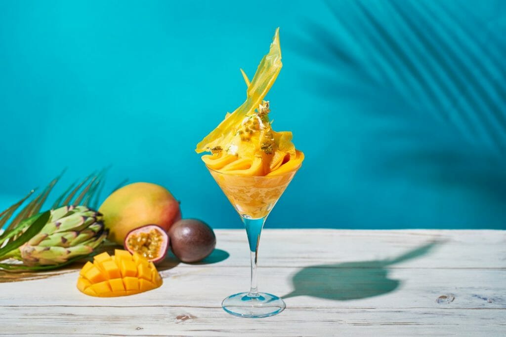「マンゴー」は、グラスの中央にヴァニラソフトクリームとマンゴーやパッションフルーツのソルベを積み重ね、その下にはマンゴーの果肉が入ったパッションフルーツのグラニテが濃厚な甘味を演出。グラスの一番下にはココナッツラムの「マリブ」、ライムゼスト、パッションフルーツとマンゴーのマリネがセットされ、南国気分を味わえる一品に仕上げました。