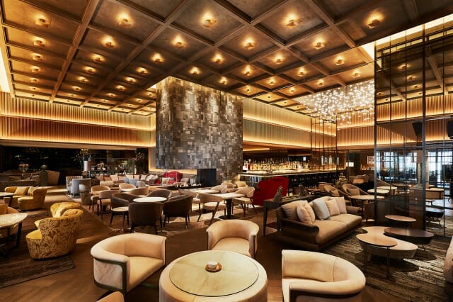2020年6月27日グランドオープンの「逢う・集う・囲む」をコンセプトにした開放的かつダイナミックなラウンジ&バー。天井高5mの「火を囲む暖炉のあるラウンジ」を空間の中心とし、7mのカウンターを備え、光と影が演出するアーティスティックで魅惑的なバーエリア「アンバー」と、ソファー席や洛中洛外図を設置したラウンジエリア、ライブラリーの落ち着いた雰囲気を醸し出すエリア「ザ ライブラリー」、会食や接待、ミーティングにも利用できるプライベートルーム「ライト」「エジソン」を完備した、人と人の交わる、同ホテルの新たなシンボルラウンジです。