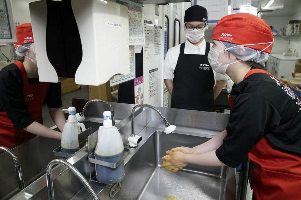 「新型コロナウイルス感染拡大の前よりスシローでは徹底した衛生対策を実施してまいりました。適切なタイミングでの現場確認者による目視確認をした上での手洗いの実施や、目視を含めた身だしなみチェック、体調管理チェックの実施・記録、体調不良者の出勤禁止等の取り組み等、弊社内にある衛生管理の専門チームが定める社内ルールのもとで徹底した衛生管理に取り組んでおります。また、キッチン内の出入りの際の手袋着用・交換はもちろん、食品に触れた手袋は一定のタイミングでの交換を徹底しております。あわせて、30分に1回キッチン内にて流れる衛生確認の放送に従いアルコール消毒による清掃を行う等、清潔で安全な環境を維持することに努めてまいりました。