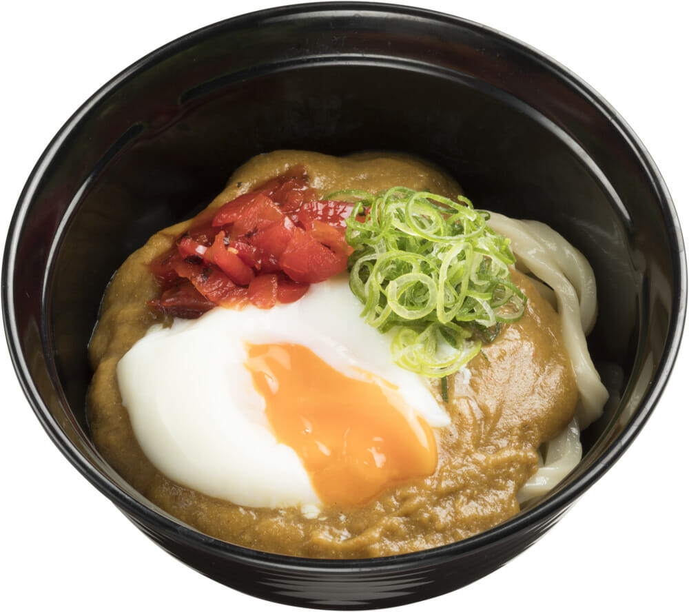 「あの人が!超べた惚れカレーのうどん」は、東京に3店舗展開している、大人気カレー専門店「大阪マドラスカレー」とのコラボレーション商品です。甘くて辛くて旨いカレーとして人気の「大阪マドラスカレー」のカレーを、スシローではカレーうどんにアレンジしました。フルーツ由来のさわやかな甘さのあるカレーは、味がしっかりしており、口に入れた瞬間は甘く、後から辛さが引き立つ甘さと辛さのバランスが絶妙です。そこにスシローオリジナルのコクのあるだしをあわせることで、よりカレーの旨みを引き出す至福の一杯に仕上げました。さらに、トッピングの半熟たまごと福神漬けをあわせて食べることで、コク深いだしの味わいと甘辛旨いカレー、まろやかなたまごが融合した忘れられない旨さになります。